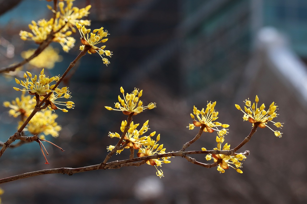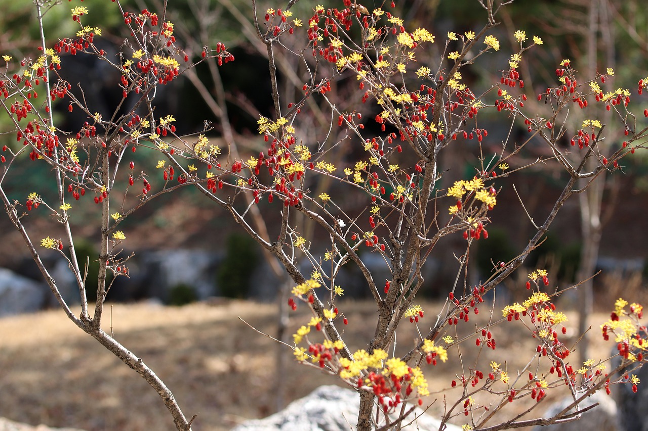산수유는 가장 먼저 피어 봄을 알리는 꽃입니다. 개화 시기는 남부지방은 2월 말에서 3월 초, 전국적인 만개 시기는