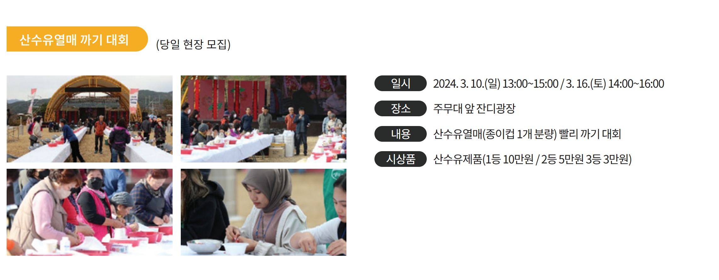 초대가수의 공연과 함께 산수유 열매 까기 , 산수유 꽃길 걷기 등의 체험 프로그램이 마련되어 있어요.